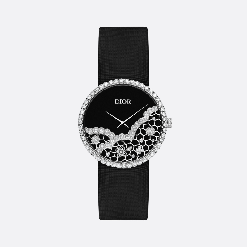 Dior takes a jewellery approach to watchmaking in this timepiece, transforming materials such as gold and onyx into a fabric-like texture. A delicate embellishment of diamonds completes this lace-like, dazzling dial.