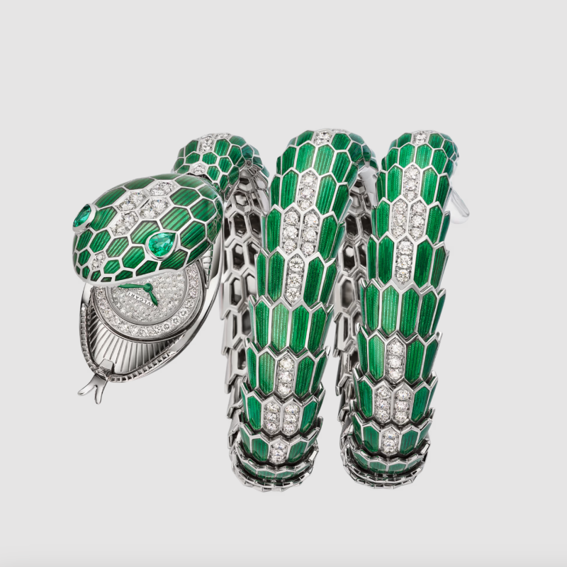 The wrap-around watch from Bulgari’s Serpenti collection this time comes with a twist: The dial is concealed within the serpent’s mouth.