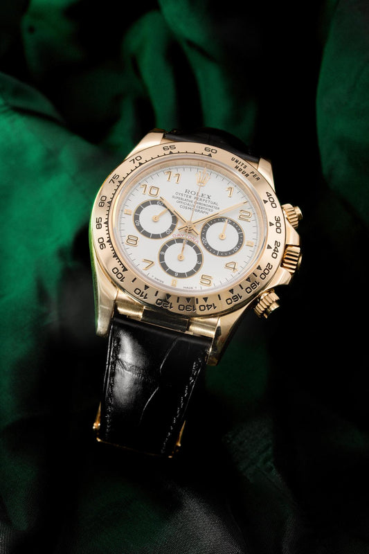 The Cosmograph Daytona features a legendary white background with black counters, which earned it the name “Panda” among collectors.
