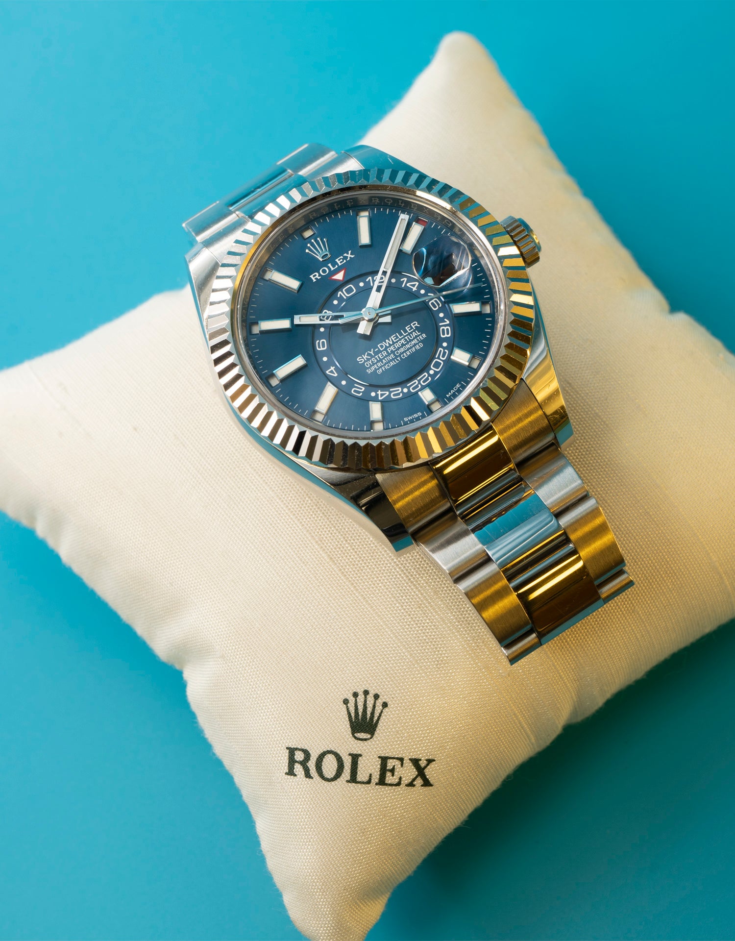 The waiting list for a Sky-Dweller varies by colour and metal combination. Plain stainless steel versions with blue and mint green dials have the longest waiting times (around 2-5 years) while gold and two-tone dials come available faster. At Trilogy, we can source almost any used Rolex Sky-Dweller for sale - just let us know which version you like and we’ll get to work.